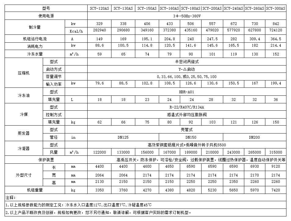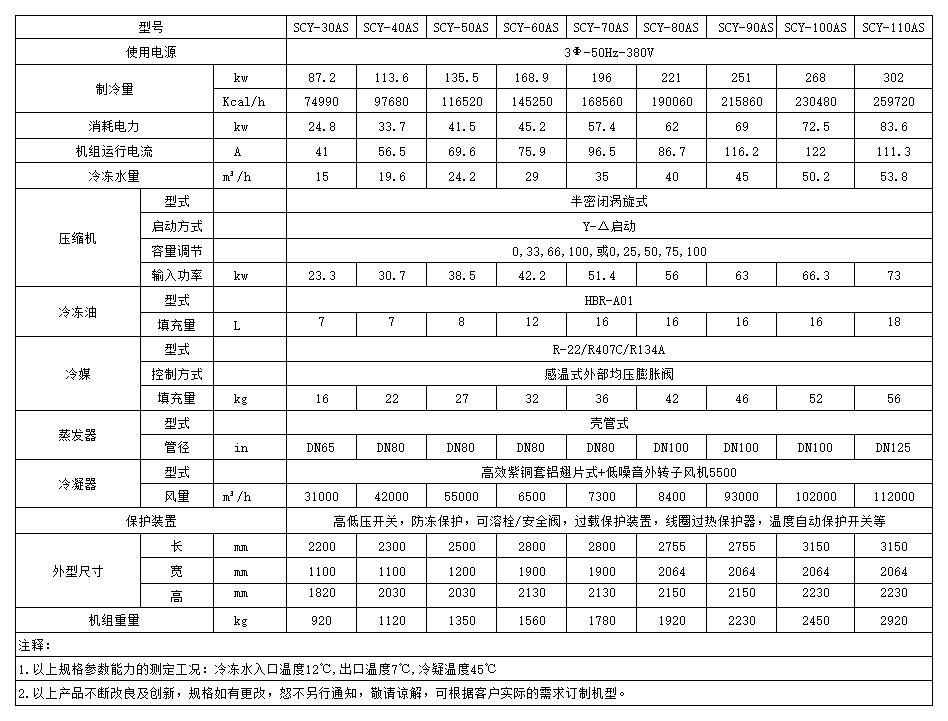 风冷螺杆式工业冷水机组性能参数表