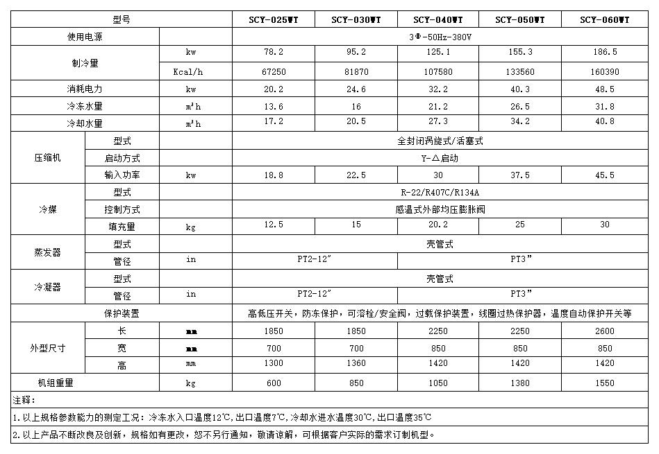 水冷模块式工业冰水机组性能参数表: